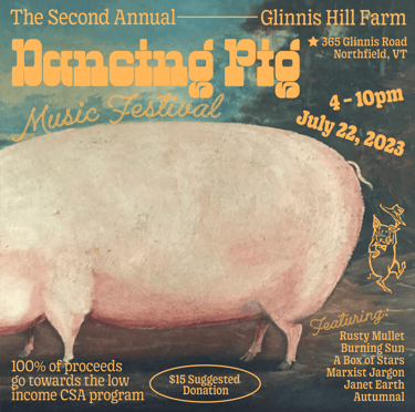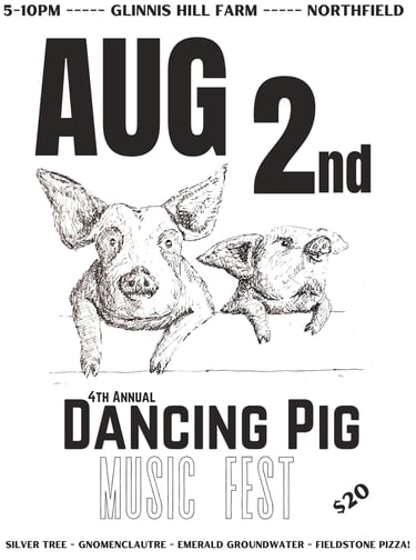 Musicians at the 3rd Annual Dancing Pig Fest included Erin Cassales-Brown, Katy Hellman, Reid Parsons, Brass Balagan, Bread Boy, and Rusty Mullet. With wood fired pizza from Fieldstone Farm!